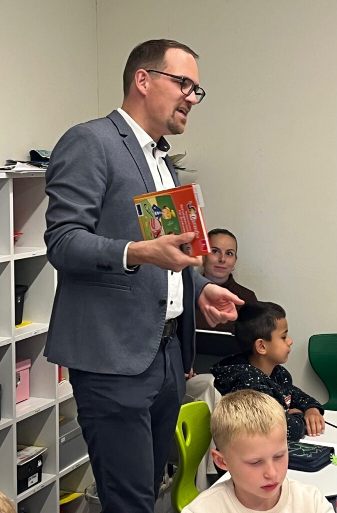 Herr Reiß erklärte den Schülerinnen und Schülern, wie wichtig das Lesen für das Lernen, die Fantasie und den Alltag ist. Er nahm sich außerdem sehr viel Zeit für die Kinder und beantwortete jede Menge Fragen.